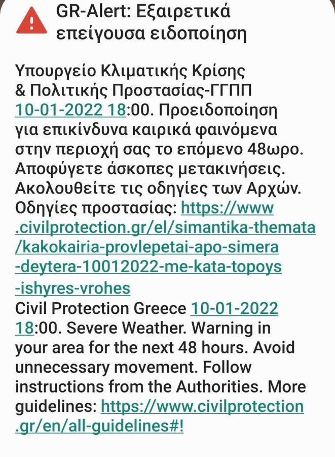 Tο 112 της Γενικής Γραμματείας Πολιτικής Προστασίας ενεργοποιήθηκε στέλνοντας προειδοποίηση για επικίνδυνα καιρικά φαινόμενα