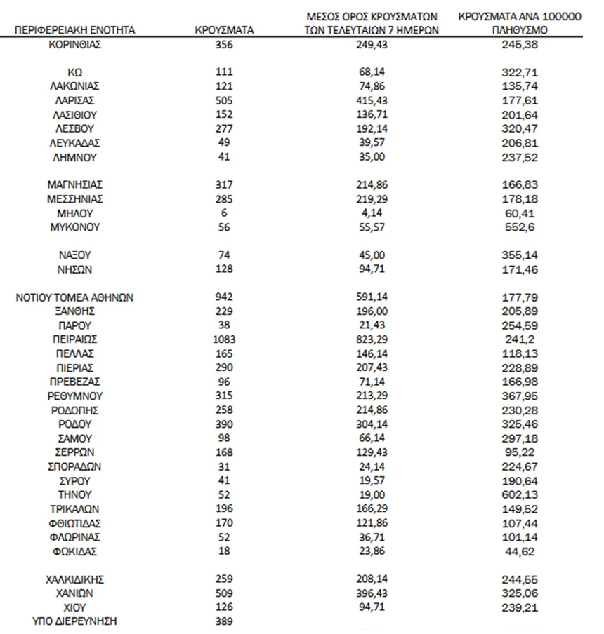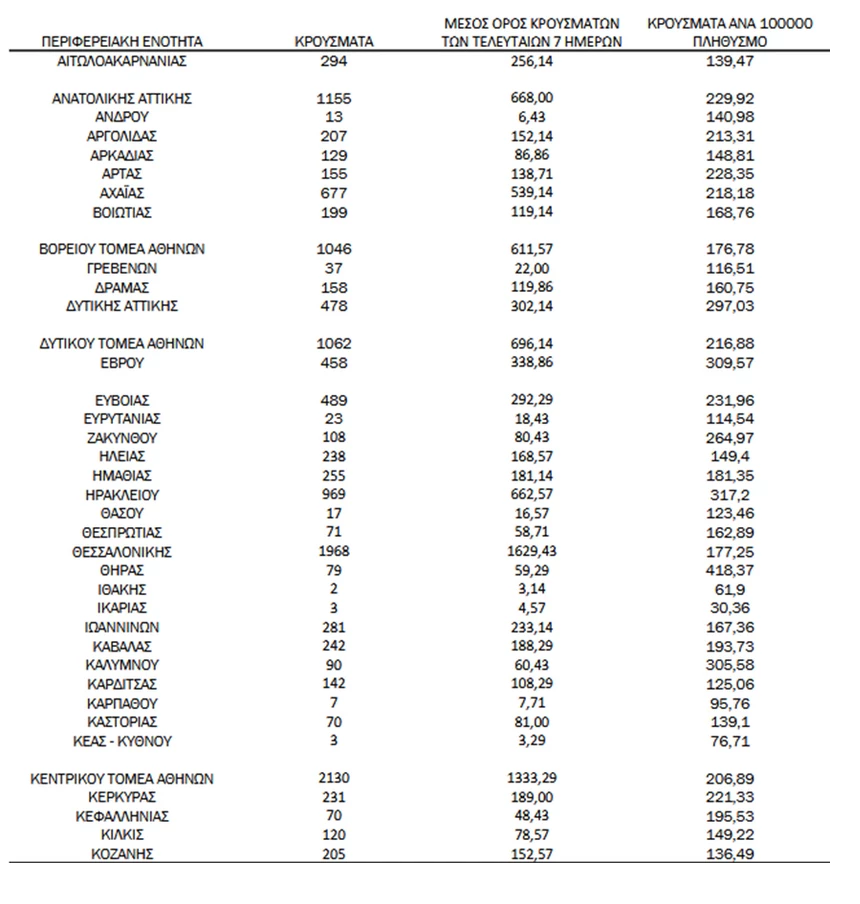 «Τα νέα εργαστηριακά επιβεβαιωμένα κρούσματα της νόσου που καταγράφηκαν τις τελευταίες 24 ώρες είναι 22.362 , εκ των οποίων 84 εντοπίστηκαν κατόπιν ελέγχων στις πύλες εισόδου της χώρας. Ο συνολικός αριθμός των κρουσμάτων ανέρχεται σε 1.890.296 (ημερήσια μεταβολή +1.2%), εκ των οποίων 49.8% άνδρες. Με βάση τα επιβεβαιωμένα κρούσματα των τελευταίων 7 ημερών, 425 θεωρούνται σχετιζόμενα με ταξίδι από το εξωτερικό και 1.220 είναι σχετιζόμενα με ήδη γνωστό κρούσμα.