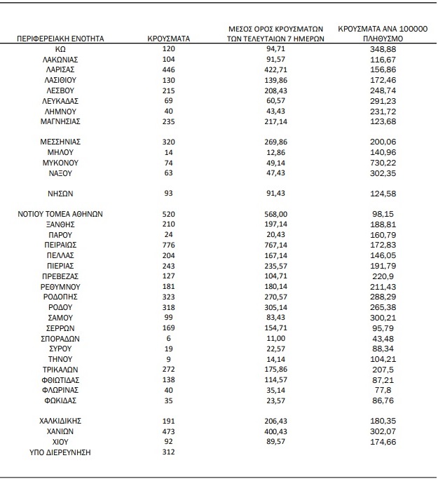 Ο συνολικός αριθμός των κρουσμάτων ανέρχεται σε 2.002.206 (ημερήσια μεταβολή +0.9%), εκ των οποίων 49.8% άνδρες. Με βάση τα επιβεβαιωμένα κρούσματα των τελευταίων 7 ημερών, 412 θεωρούνται σχετιζόμενα με ταξίδι από το εξωτερικό και 2.472 είναι σχετιζόμενα με ήδη γνωστό κρούσμα.