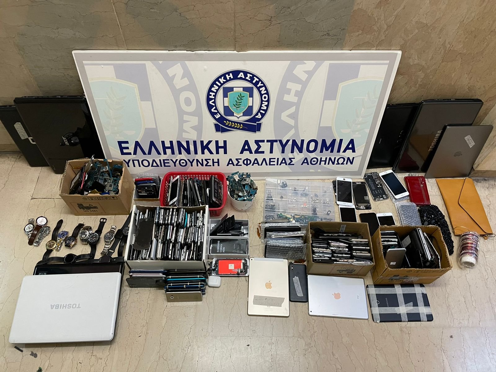 Από τις έρευνες που πραγματοποιήθηκαν σε 20 σπίτια μελών της εγκληματικής οργάνωσης, καθώς και σε 2 καταστήματα των κλεπταποδόχων, βρέθηκαν μεταξύ άλλων και κατασχέθηκαν: 10 φορητοί ηλεκτρονικοί υπολογιστές, 83 κινητά τηλέφωνα, 11 ρολόγια, 5 πορτοφόλια, 3 τσάντες, πλήθος από γυναικεία βραχιόλια, 3.070 ευρώ, 5 ιδιωτικής χρήσεως αυτοκίνητα, 2 μοτοσυκλέτες, πλήθος εξαρτημάτων κινητών τηλεφώνων, τάμπλετ και φορητών υπολογιστών, 308 πακέτα τηλεφωνικών συνδέσεων, μικροποσότητα ακατέργαστης κάνναβης, καθώς και πλήθος εγγράφων, ιδιόχειρων σημειώσεων, καρτών για τα μέσα μαζικής μεταφοράς και αποδείξεων συναλλαγών χρηματικών ποσών.