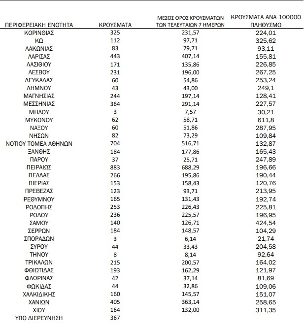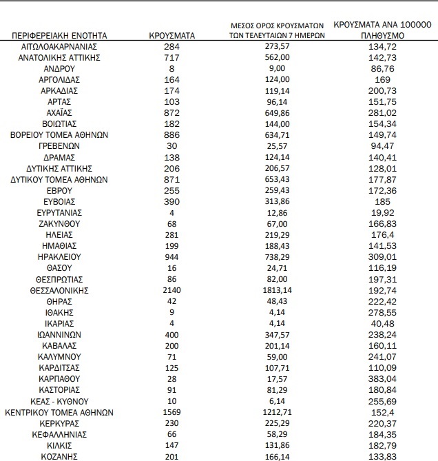 Από τα στοιχεία αυτά προκύπτει πως από τα συνολικά 19509 κρούσματα που καταγράφηκαν το τελευταίο 24ωρο στην Ελλάδα, τα 5918 εντοπίστηκαν στην Αττική, τα 2140 στη Θεσσαλονίκη, ενώ το Ηράκλειο παραμένει σε υψηλά επίπεδα, αγγίζοντας τα 1000 (944).