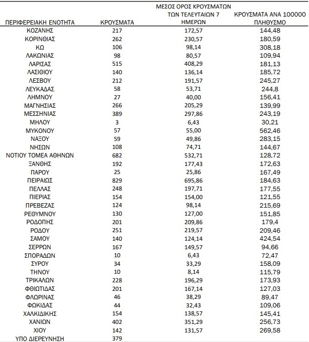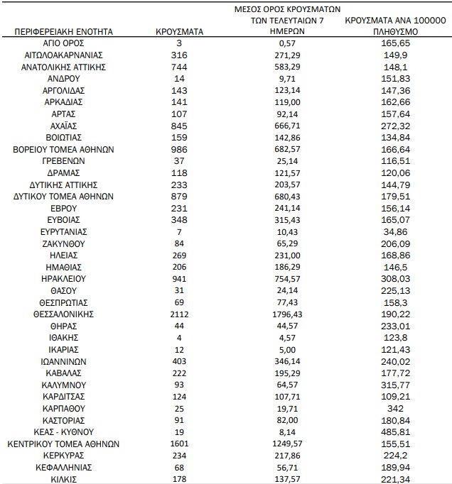 Οι περιοχές – πλην Αττικής και Θεσσαλονίκης – που καταγράφουν άνω των 100 κρουσμάτων, είναι: