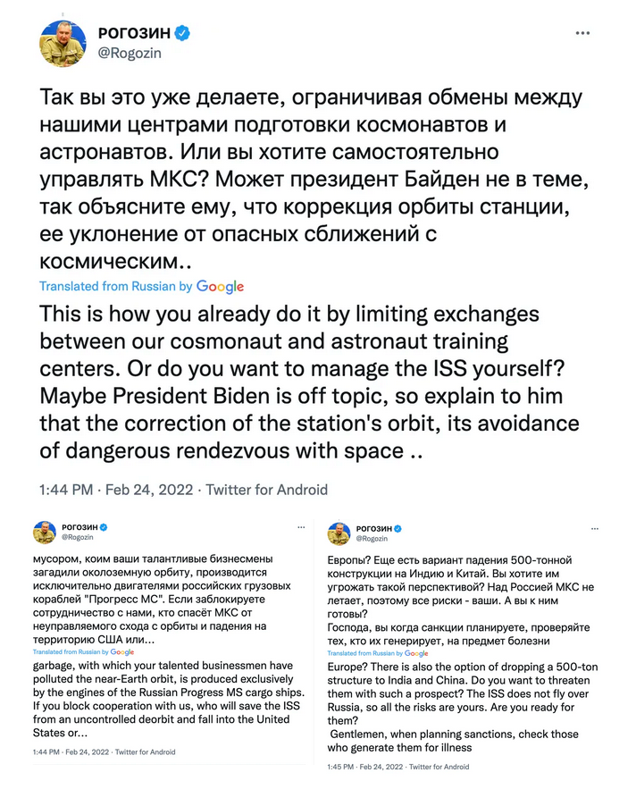 Συγκεκριμένα, ο επικεφαλής της Roscosmos Ντιμίτρι Ρογκόζιν δήλωσε ότι "αν μπλοκάρετε τη συνεργασία σας με μας, ποιος θα σώσει τον ISS από το να τεθεί ανεξέλεγκτα εκτός τροχιάς και να πέσει στην περιοχή των ΗΠΑ ή της Ευρώπης; Υπάρχει επίσης πιθανότητα πτώσης του 500 τόνων σταθμού στην Ινδία ή στην Κίνα. Θέλετε να τους απειλήσετε με μια τέτοια προοπτική; Ο ISS δεν περνάει πάνω από τη Ρωσία, συνεπώς οι κίνδυνοι είναι όλοι δικοί σας. Είστε έτοιμοι γι' αυτούς;".