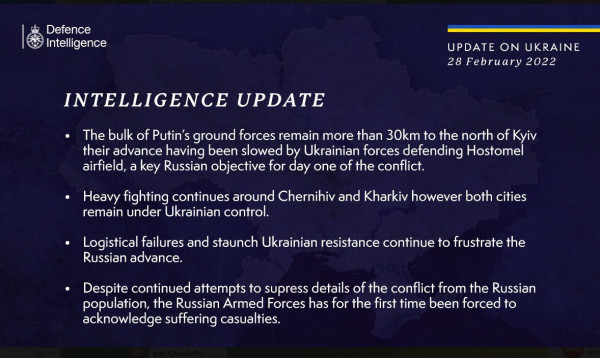 «Το μεγαλύτερο μέρος των χερσαίων δυνάμεων του Ρώσου προέδρου Βλαντίμιρ Πούτιν παραμένει περισσότερα από 30 χιλιόμετρα βόρεια του Κιέβου και η προέλασή τους καθυστερεί επειδή οι ουκρανικές δυνάμεις υπερασπίζονται το αεροδρόμιο Χοστομέλ, έναν από τους βασικούς στόχους των Ρώσων ήδη από την πρώτη ημέρα των συγκρούσεων», πρόσθεσε το υπουργείο.