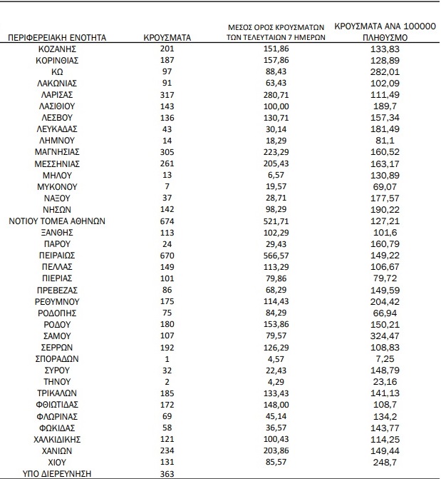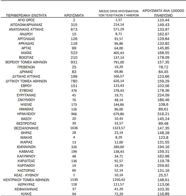 Από τα στοιχεία προκύπτει ότι από τα συνολικά 16.274 κρούσματα του τελευταίο 24ώρου, τα 5.599 εντοπίστηκαν στην Αττική και τα 1636 στη Θεσσαλονίκη.