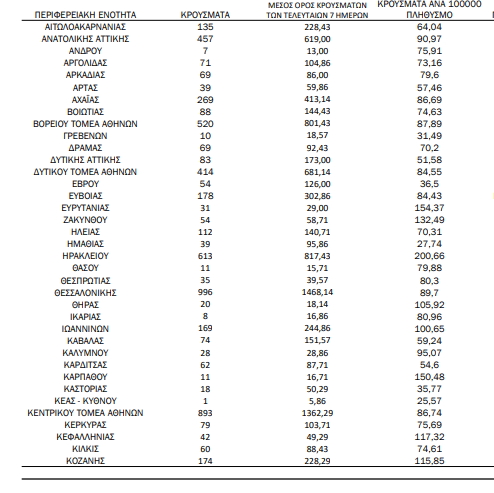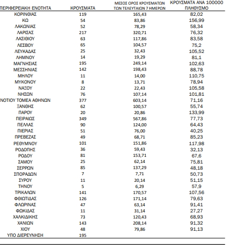 Σημειώνεται πως υψηλά κρούσματα κατέγραψε την Κυριακή και η Αχαΐα (269), καθώς επίσης το Ηράκλειο (613) και η Λάρισα (217).
