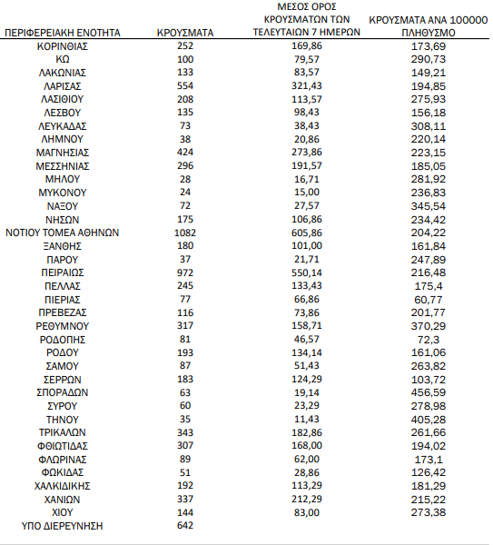 Τα νέα εργαστηριακά επιβεβαιωμένα κρούσματα της νόσου που καταγράφηκαν τις τελευταίες 24 ώρες είναι 23.335, εκ των οποίων 33 εντοπίστηκαν κατόπιν ελέγχων στις πύλες εισόδου της χώρας. Ο συνολικός αριθμός των κρουσμάτων ανέρχεται σε 2.561.503 (ημερήσια μεταβολή +0.9%), εκ των οποίων 49.4% άνδρες. Με βάση τα επιβεβαιωμένα κρούσματα των τελευταίων 7 ημερών, 201 θεωρούνται σχετιζόμενα με ταξίδι από το εξωτερικό και 1.222 είναι σχετιζόμενα με ήδη γνωστό κρούσμα. To RT για την επικράτεια βάσει των κρουσμάτων εκτιμάται σε 0.99 (95% ΔΕ: 0.89 – 1.09).