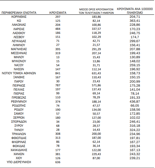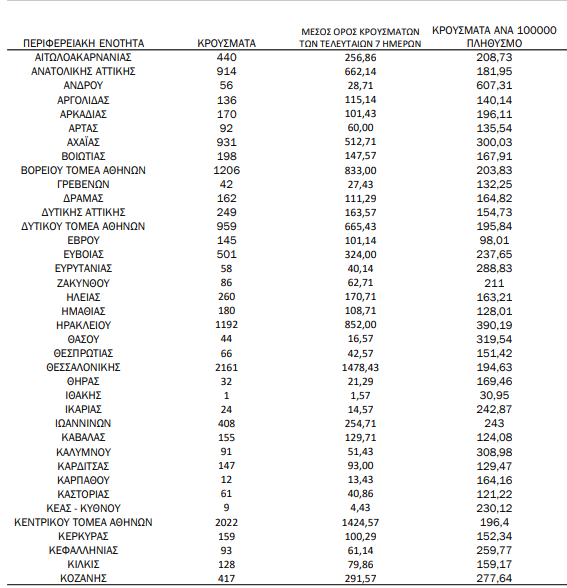Τα νέα εργαστηριακά επιβεβαιωμένα κρούσματα της νόσου που καταγράφηκαν τις τελευταίες 24 ώρες είναι 21.863, εκ των οποίων 25 εντοπίστηκαν κατόπιν ελέγχων στις πύλες εισόδου της χώρας. Ο συνολικός αριθμός των κρουσμάτων ανέρχεται σε 2.583.366 (ημερήσια μεταβολή +0.9%), εκ των οποίων 49.4% άνδρες. Με βάση τα επιβεβαιωμένα κρούσματα των τελευταίων 7 ημερών, 196 θεωρούνται σχετιζόμενα με ταξίδι από το εξωτερικό και 1.077 είναι σχετιζόμενα με ήδη γνωστό κρούσμα.