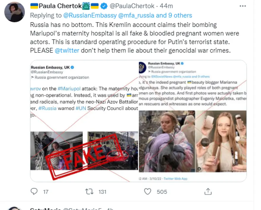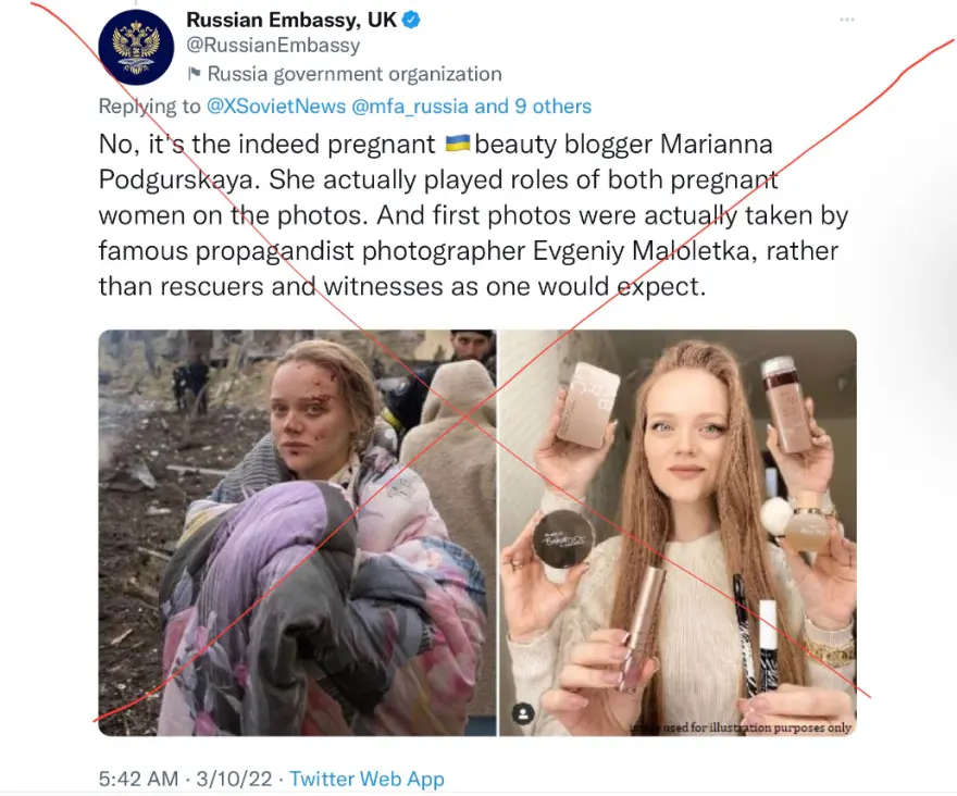 Υπενθυμίζεται πως η νεαρή έγκυος γυναίκα είχε βρεθεί στο στόχαστρο της ρωσικής προπαγάνδας όταν ρωσικά μίντια αλλά και η ίδια η ρωσική πρεσβεία στη Μεγάλη Βρετανία, είπε πως δεν ήταν έγκυος και δεν βρισκόταν στο συγκεκριμένο κτήριο αλλά ήταν ηθοποιός η οποία μάλιστα έβαλε μέικ απ για να δείξει πως έχει αίματα από την επίθεση.