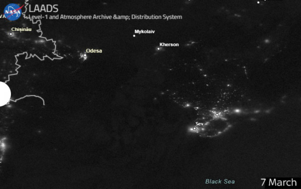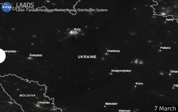Η παρακάτω εικόνα ελήφθη στις 7 Φεβρουαρίου 2022. Δείχνει την Ουκρανία τη νύχτα λίγες ημέρες πριν την εισβολή της Ρωσίας. Οι συστάδες φώτων σε πόλεις ή σε ορισμένους σημαντικούς δρόμους εμφανίζονται με λευκό χρώμα στον χάρτη.