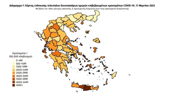 Γεωγραφική διασπορά: Ο χάρτης αποτυπώνει τη γεωγραφική κατανομή των κρουσμάτων COVID-19 των τελευταίων 14 ημερών ανά Περιφερειακή Ενότητα της χώρας, με βάση την δηλωθείσα διεύθυνση μόνιμης κατοικίας του ασθενούς, ή τη διεύθυνση προσωρινής διαμονής για τους τουρίστες και άλλους προσωρινά διαμένοντες στην Ελλάδα. Συμπεριλαμβάνονται τόσο κρούσματα με ιστορικό ταξιδίου (“εισαγόμενα”) όσο και κρούσματα με πιθανή εγχώρια μετάδοση.