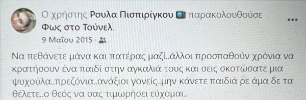 Όλες οι αναρτήσεις της Ρούλας Πισπιρίγκου, της μητέρας των τριών κοριτσιών από την Πάτρα που πέθαναν μέσα σε τρία μόλις χρόνια, έχουν προκαλέσει αίσθηση.