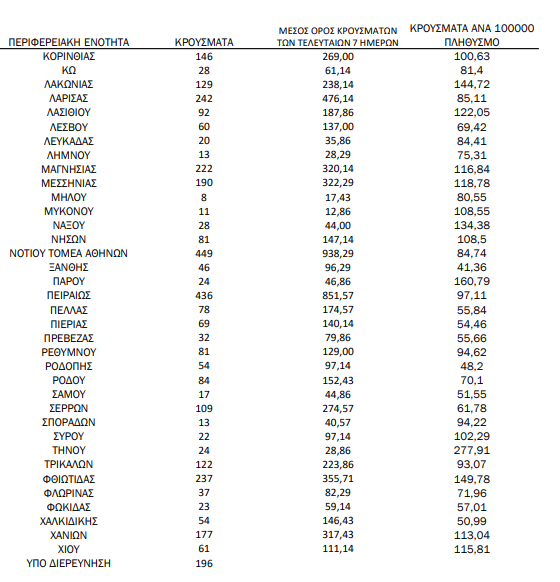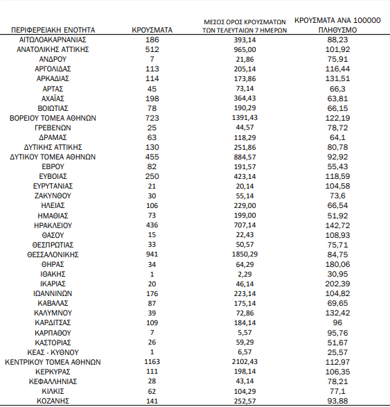 Οι περιοχές – πλην Αττικής και Θεσσαλονίκης – που καταγράφουν άνω των 100 κρουσμάτων, είναι: