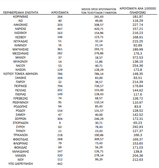 Άλλες 33 περιοχές είναι στο «κόκκινο» αφού καταγράφουν τριψήφιο αριθμό μολύνσεων. Σύμφωνα με την ανακοίνωση του ΕΟΔΥ, υπό διερεύνηση είναι άλλα 442 κρούσματα.
