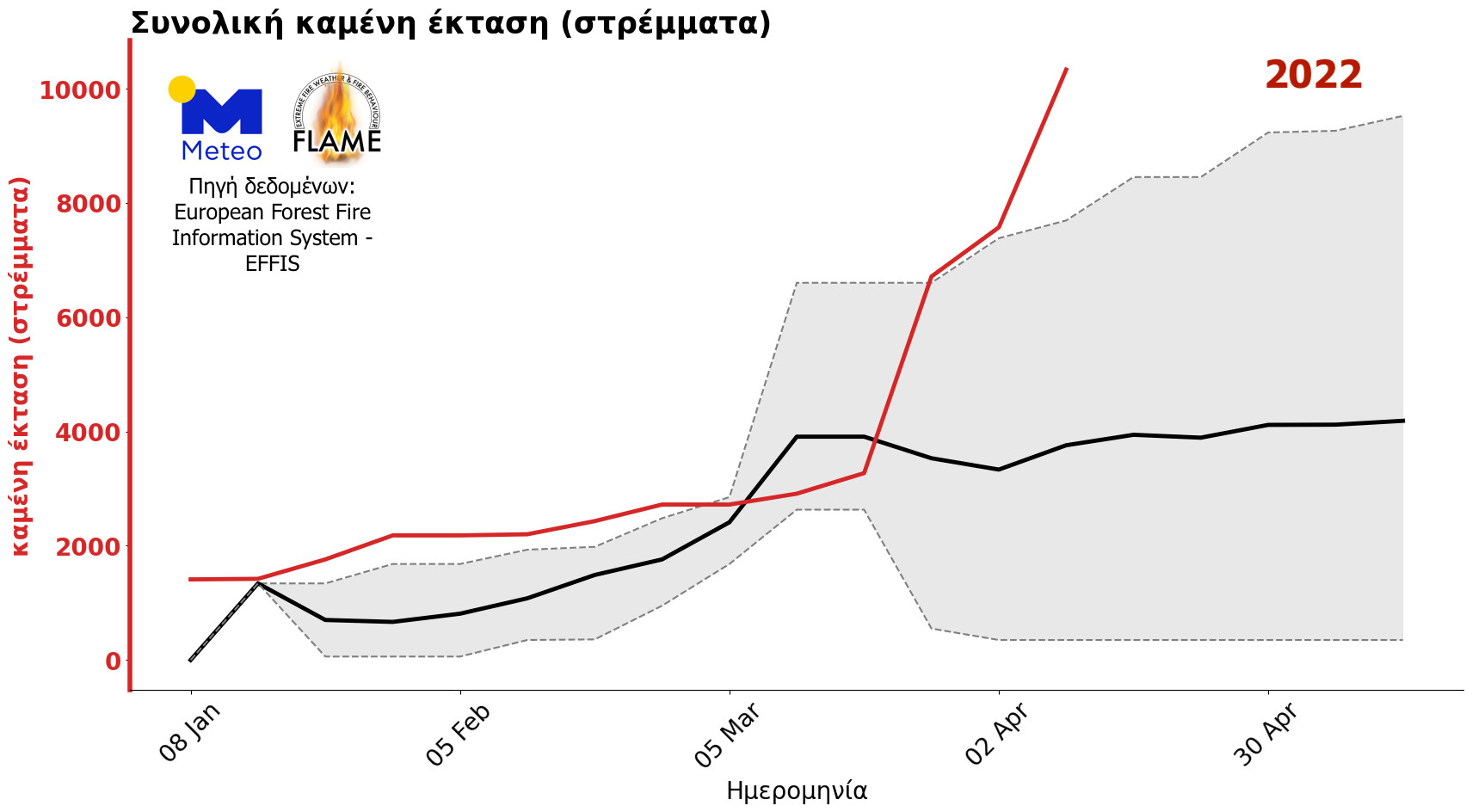 Εξίσου ανησυχητική, σύμφωνα με το meteo, είναι και η εξαιρετικά μεγάλη αύξηση της συνολικής καμένης έκτασης στη χώρα μας, η οποία φτάνει το 275% σε σχέση με τον μέσο όρο της περιόδου 2008-2021.