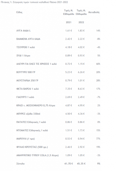 Συνολικά το μέσο τυπικό καλάθι του 2021 στις μεγάλες αλυσίδες σουπερμάρκετ μη συμπεριλαμβανομένων αμνοεριφίων υπολογίζεται στα 45,35€ με αύξηση κατά 9% σε σχέση με το 2021 όταν ήταν 41,70€ . Η αύξηση αυτή είναι αναμενόμενη με βάση την εικόνα εικόνα των πληθωριστικών πιέσεων τους τελευταίους μήνες. Παράλληλα το μέσο εύρος τιμών (διαφορά μικρότερης με μέγιστης τιμής τυπικού καλαθιού) εντός των εξεταζόμενων κατηγοριών παραμένει υψηλό με 35%, καταδεικνύοντας ότι οι καταναλωτές για άλλη μία χρονιά έχουν πρόσβαση σε μεγάλο εύρος εναλλακτικών επιλογών (διαφορετικές ποικιλίες, ποιότητες, προϊόντα ιδιωτικής ετικέτας, αξιοποίηση προσφορών και εκπτώσεων.