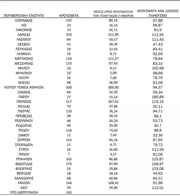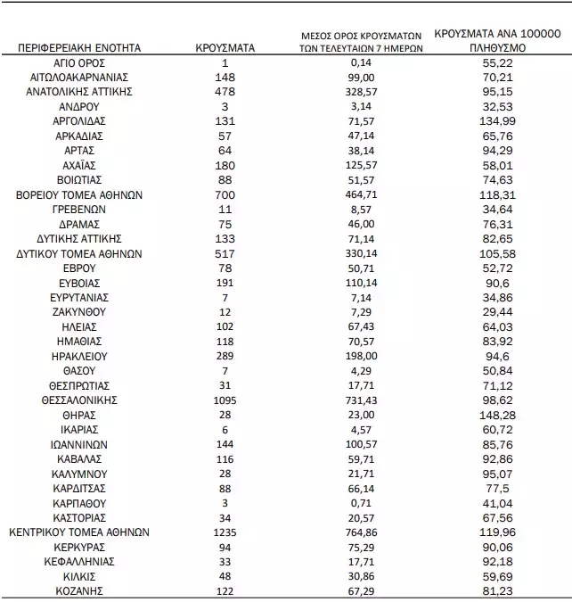 Οι περιοχές – πλην Αττικής και Θεσσαλονίκης – που καταγράφουν τριψήφιο αριθμό κρουσμάτων, είναι: