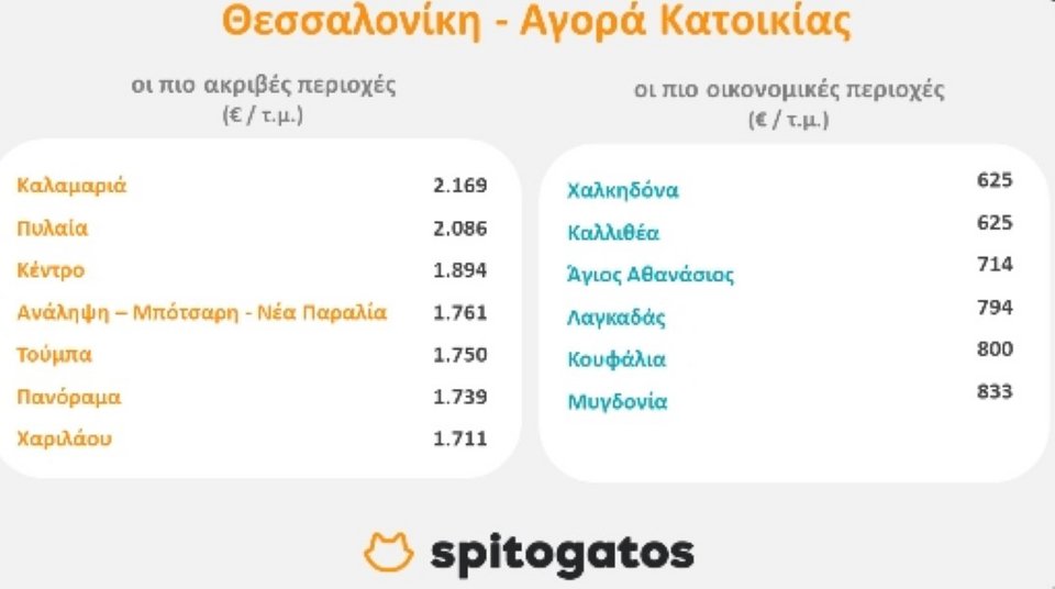 Αντίστοιχα, στη Θεσσαλονίκη, οι πιο ακριβές περιοχές για αγορά κατοικίας το α’ τρίμηνο του 2022 ήταν, μεταξύ άλλων, η Καλαμαριά, η περιοχή του κέντρου και το Πανόραμα -στοιχείο το οποίο δεν προκαλεί εντύπωση καθώς πρόκειται για περιοχές που παραδοσιακά ανήκουν στις ακριβότερες τις συμπρωτεύουσας, η περιοχή Ανάληψη - Μπότσαρη - Νέα Παραλία, η Πυλαία και η Τούμπα. Ως προς την αγορά κατοικίας, οι οικονομικότερες περιοχές περιλαμβάνουν, μεταξύ άλλων, την Καλλιθέα, τη Χαλκηδόνα, τον Άγιο Αθανάσιο, τον Λαγκαδά και τα Μυγδόνια.