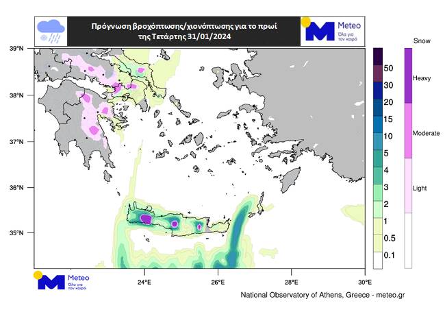 Βροχές και σποραδικές καταιγίδες αναμένονται έως το βράδυ σε περιοχές χαμηλού υψομέτρου της Μαγνησίας, της Κεντρικής και Ανατολικής Στερεάς, της Ανατολικής Πελοποννήσου, της Εύβοιας, της Κρήτης και στα νησιά του Κεντρικού και Νοτίου Αιγαίου. Χιονοπτώσεις θα εκδηλωθούν σε ορεινά και ημιορεινά τμήματα της Μαγνησίας, της Κεντρικής και Ανατολικής Στερεάς, της Πελοποννήσου, της Εύβοιας και της Κρήτης.
