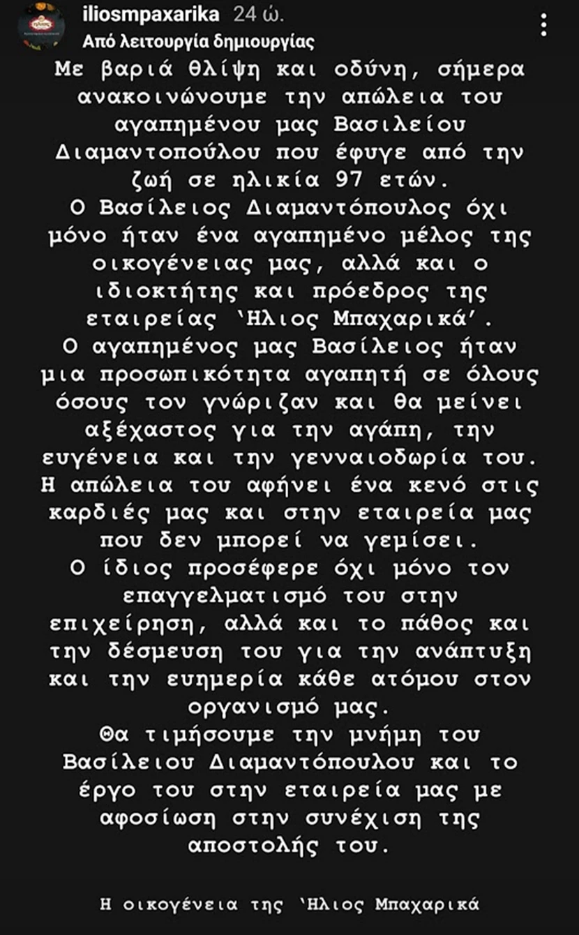 «Με βαθιά θλίψη και οδύνη, σήμερα ανακοινώνουμε την απώλεια του αγαπημένου μας Βασίλειου Διαμαντόπουλου που έφυγε από τη ζωή τη 13/02/2024 πλήρης ημερών.