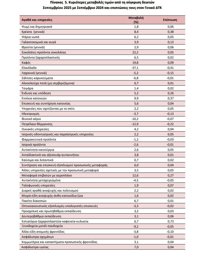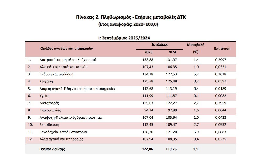 Η αύξηση του γενικού δείκτη τιμών κατά 0,8% τον μήνα Σεπτέμβριο 2025, σε σύγκριση με τον Αύγουστο του 2025, προήλθε κυρίως από τις αυξήσεις των δεικτών κατά 0,4% στην ομάδα Αλκοολούχα ποτά και καπνός, λόγω αύξησης κυρίως των τιμών στα αλκοολούχα ποτά (μη σερβιριζόμενα).