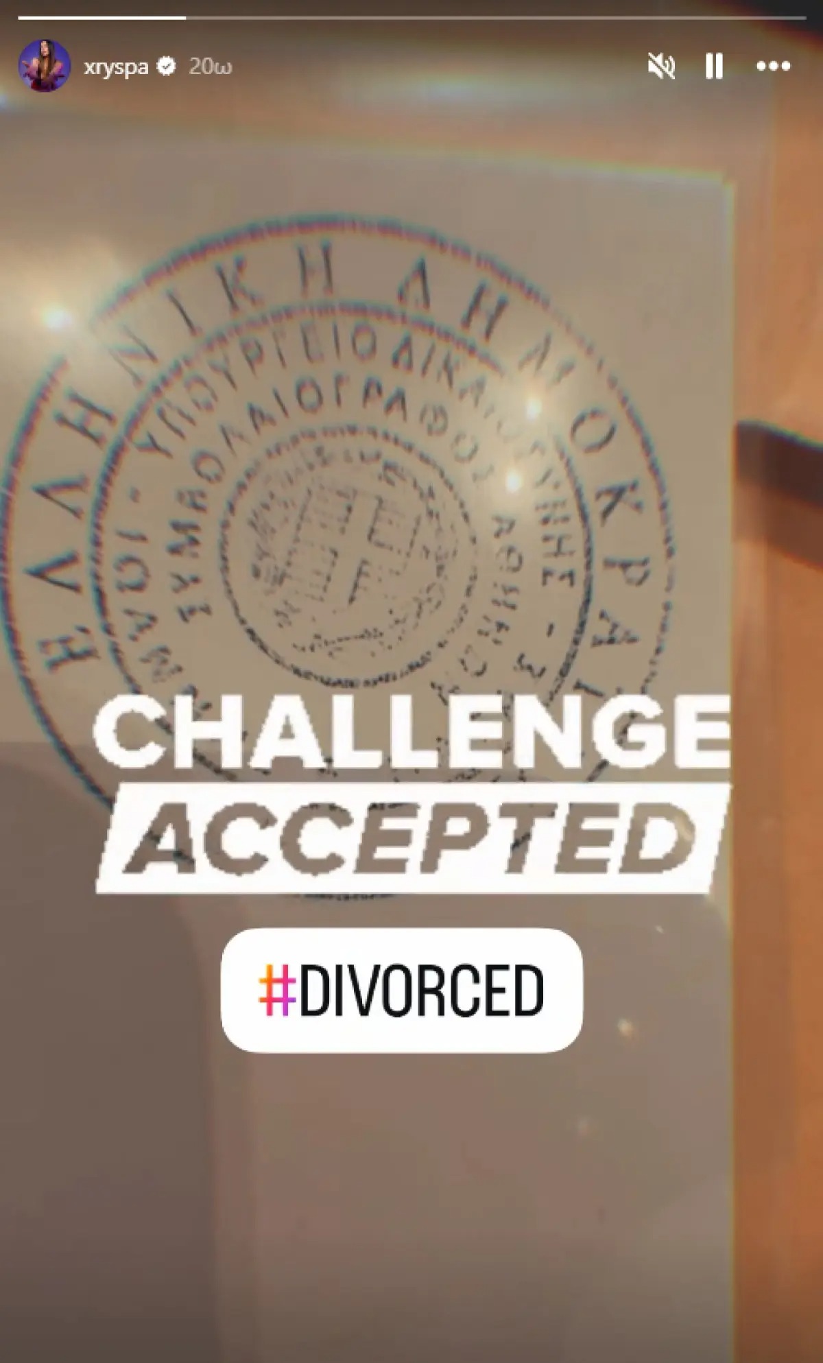 Δημοσίευσε, συγκεκριμένα, μία φωτογραφία από τα χαρτιά του διαζυγίου και έγραψε πάνω σε αυτή: «Challenge accepted #Divorced». Το θέμα αυτό συζητήθηκε και στην εκπομπή του ΑΝΤ1, Πρωινό, το πρωί της Τετάρτης 12 Νοεμβρίου, με τον Γιώργο Λιάγκα να εξηγεί πως ήρθαν σε επικοινωνία με την τραγουδίστρια και τους ανέφερε πως είναι κάτι που είχε ανάγκη να επικοινωνήσει με τον κόσμο.