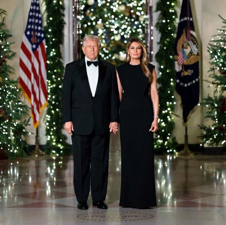 Στο στιγμιότυπο, ο Ντόναλντ Τραμπ και η Μελάνια Τραμπ ποζάρουν πιασμένοι χέρι-χέρι μπροστά από χριστουγεννιάτικες διακοσμήσεις, με την αμερικανική σημαία και τη σημαία του προέδρου να δεσπόζουν στον χώρο του Λευκού Οίκου. Και οι δύο είναι ντυμένοι στα μαύρα και κοιτούν απευθείας τον φακό με απολύτως σοβαρό ύφος.
