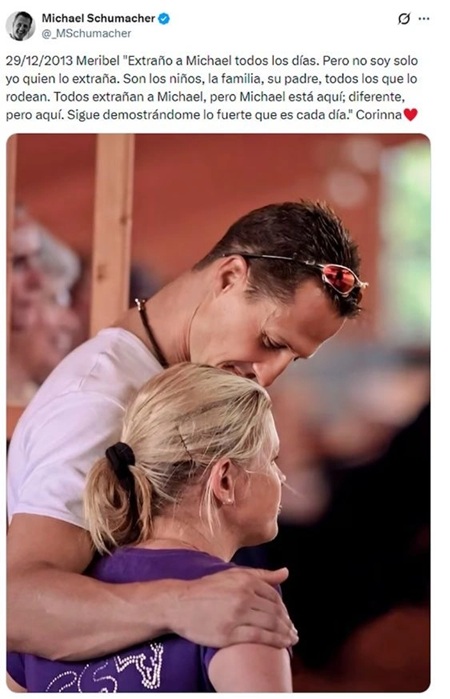 Στην επέτειο του ατυχήματος, που χιλιάδες φίλοι του μηχανοκίνητου αθλητισμού θυμούνται κάθε χρόνο, η Κορίνα Σουμάχερ δημοσίευσε ένα ιδιαίτερα φορτισμένο μήνυμα στους επίσημους λογαριασμούς του επτάκις παγκόσμιου πρωταθλητή. «Μου λείπει ο Μίκαελ κάθε μέρα.
