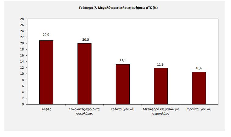 Από τα στοιχεία της ΕΛΣΤΑΤ προκύπτει «ράλι» στις τιμές της σοκολάτας κατά 20%, των κρεάτων κατά 13,1%, των αεροπορικών εισιτηρίων κατά 11,9%, των φρούτων κατά 10,6% και του πακέτου διακοπών κατά 7,2%.