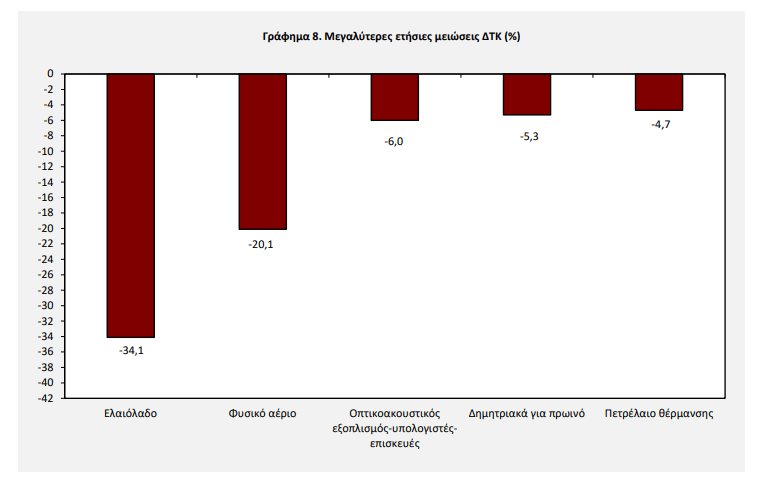 Αντίθετα στο ελαιόλαδο οι τιμές είναι μειωμένες κατά 34,1%. Φθηνότερο κατά 20,1% είναι το φυσικό αέριο σε σχέση με τον Δεκέμβριο του 2024.