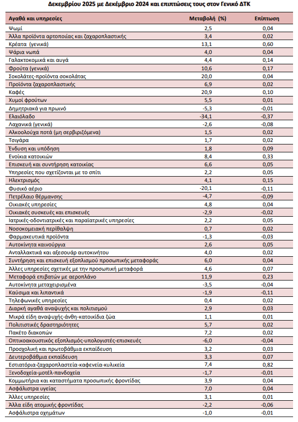 Η αύξηση του Γενικού ΔΤΚ κατά 2,6% τον μήνα Δεκέμβριο 2025, σε σύγκριση με τον αντίστοιχο Δείκτη του Δεκεμβρίου 2024,