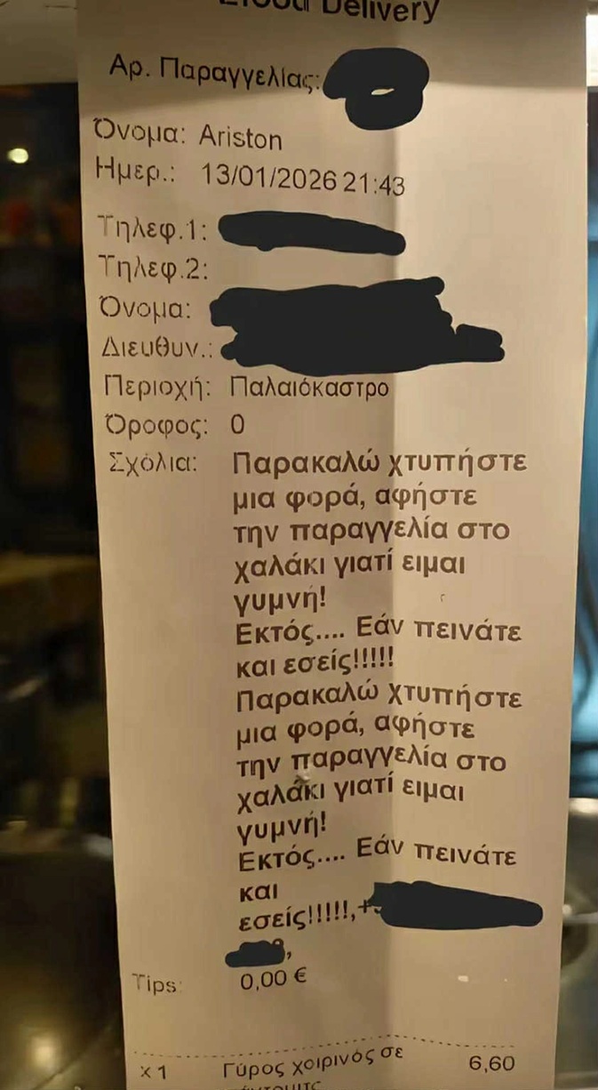Η παραγγελία έφτασε σε γνωστό ψητοπωλείο στο Ωραιόκαστρο και μέχρι εδώ όλα έμοιαζαν απολύτως συνηθισμένα. Όνομα, περιοχή, ώρα, προϊόν. Όμως στα σχόλια προς τον διανομέα, η κατάσταση πήρε απρόσμενη τροπή.