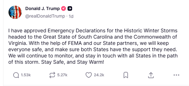 «Θα συνεχίσουμε να παρακολουθούμε την κατάσταση και να διατηρούμε επαφή με όλες τις πολιτείες που βρίσκονται στην πορεία αυτής της καταιγίδας. Παραμείνετε ασφαλείς και ζεστοί!», έγραψε ο Αμερικανός πρόεδρος Ντόναλντ Τραμπ στο Truth Social.