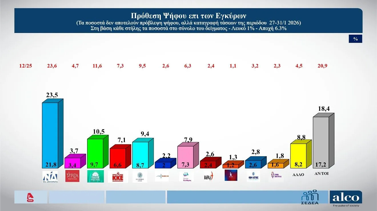 Όσον αφορά την πρόθεση ψήφου, σταθερά πρώτη εμφανίζεται η Νέα Δημοκρατία με 23,5%, ενώ ακολουθούν το ΠΑΣΟΚ με 10,5% και η Ελληνική Λύση με 9,4%.