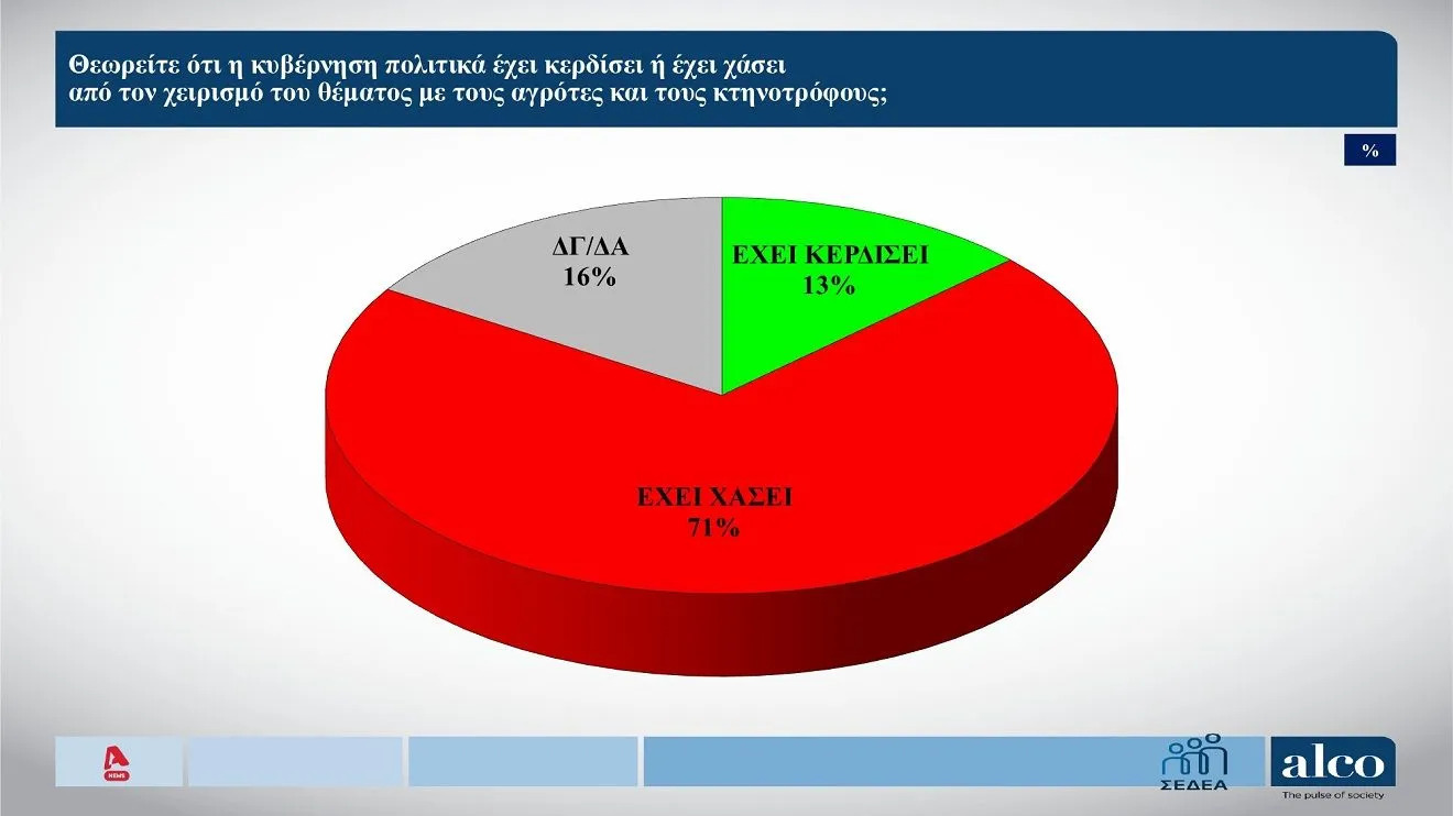 Συγκεκριμένα, στην ερώτηση “θεωρείται ότι η κυβέρνηση πολιτικά έχει κερδίσει ή έχει χάσει από τον χειρισμό του θέματος με τους αγρότες και τους κτηνοτρόφους;”, οι πολίτες απάντησαν: