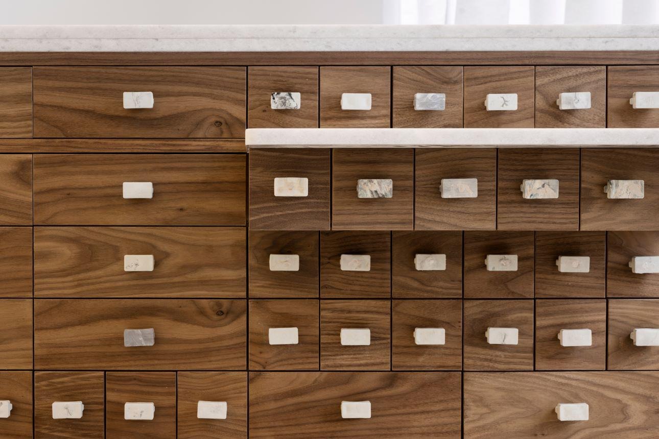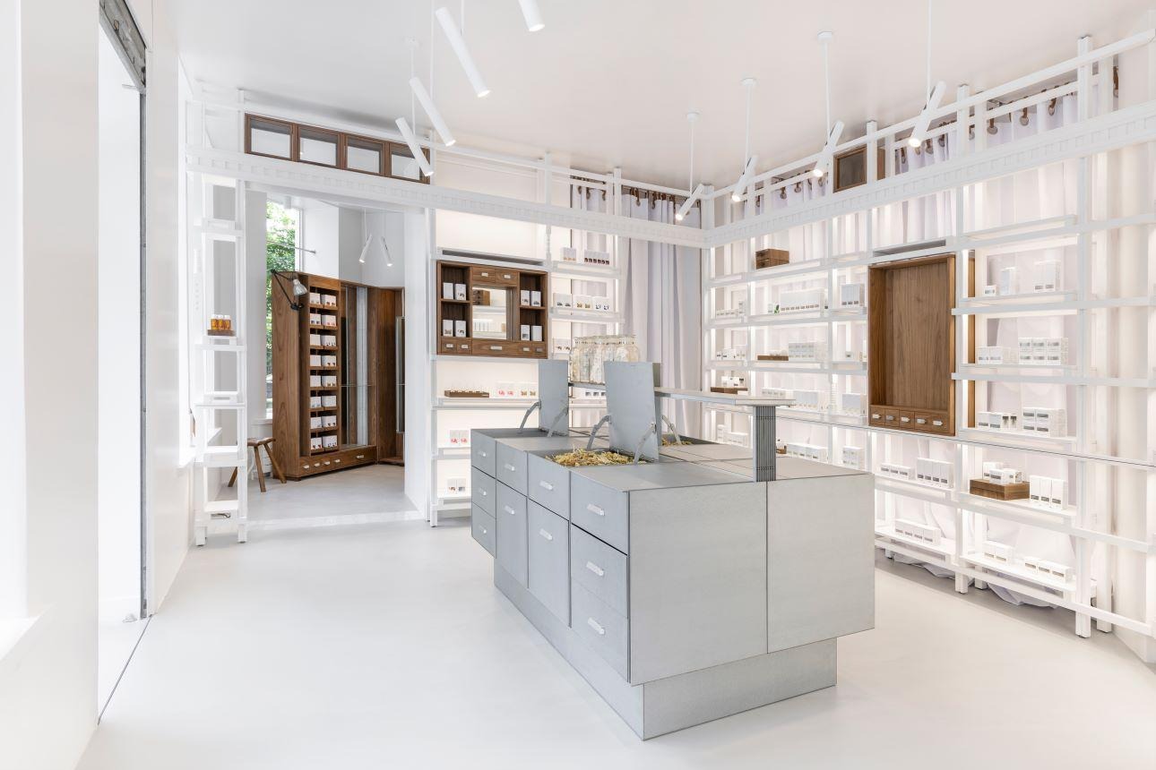 Ο κεντρικός πάγκος, με αναφορές σε εργαστηριακό τραπέζι, ενισχύει τον επιστημονικό χαρακτήρα της εταιρείας, ενώ οι συρταρωτές επιφάνειες μετατρέπονται σε ανοιχτές προθήκες που ενθαρρύνουν την αλληλεπίδραση. Παράλληλα, η ντουλάπα-μπουντουάρ για το makeup, με καθρέφτες και πλεγμένες επιφάνειες, δημιουργεί πολλαπλές αντανακλάσεις που επεκτείνουν οπτικά τον χώρο και μετατρέπουν την αγορά σε εμπειρία.