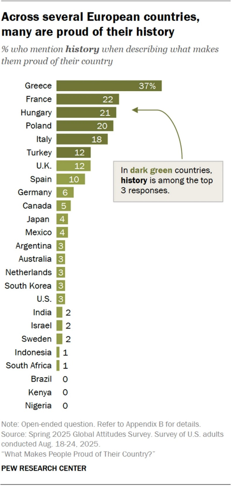 Στην Ελλάδα, το πιο ισχυρό στοιχείο υπερηφάνειας είναι ξεκάθαρο: η ιστορία. Το 37% των ερωτηθέντων τοποθετεί στο επίκεντρο την ιστορική διαδρομή της χώρας, κάνοντας αναφορές στην αρχαιότητα αλλά και στους αγώνες των προγόνων – από την Ελληνική Επανάσταση έως τον Β΄ Παγκόσμιο Πόλεμο.
