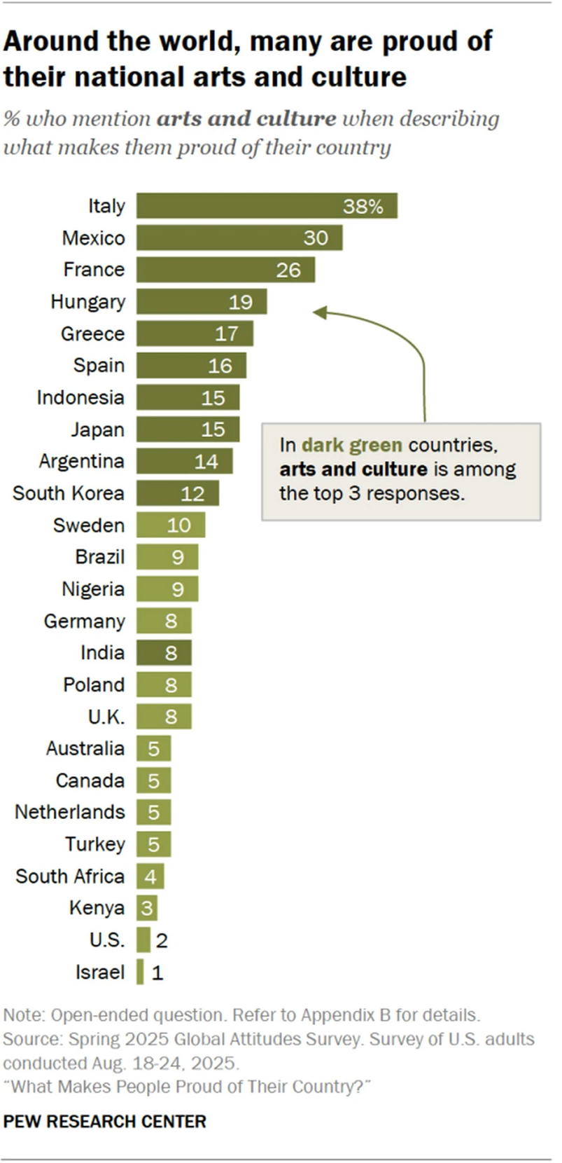 Έρευνα του Pew Research Center, που βασίστηκε σε απαντήσεις 33.486 ανθρώπων από 25 διαφορετικές χώρες, δείχνει ότι οι νεότερες ηλικίες τείνουν να δηλώνουν πιο έντονα περήφανες για τον πολιτισμό και τις τέχνες της πατρίδας τους. Ιδιαίτερα οι 18-34 ετών εμφανίζονται έως και διπλάσια πιθανό να εκφράζουν πολιτιστική υπερηφάνεια σε σχέση με όσους είναι άνω των 50.