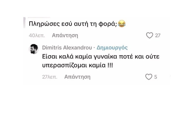 Σε σπόντα προς την Ιωάννα Τούνη, ο Δημήτρης Αλεξάνδρου ξεκαθάρισε ότι δεν αναλαμβάνει τα έξοδα ούτε υπερασπίζεται καμία από τις σχέσεις του.