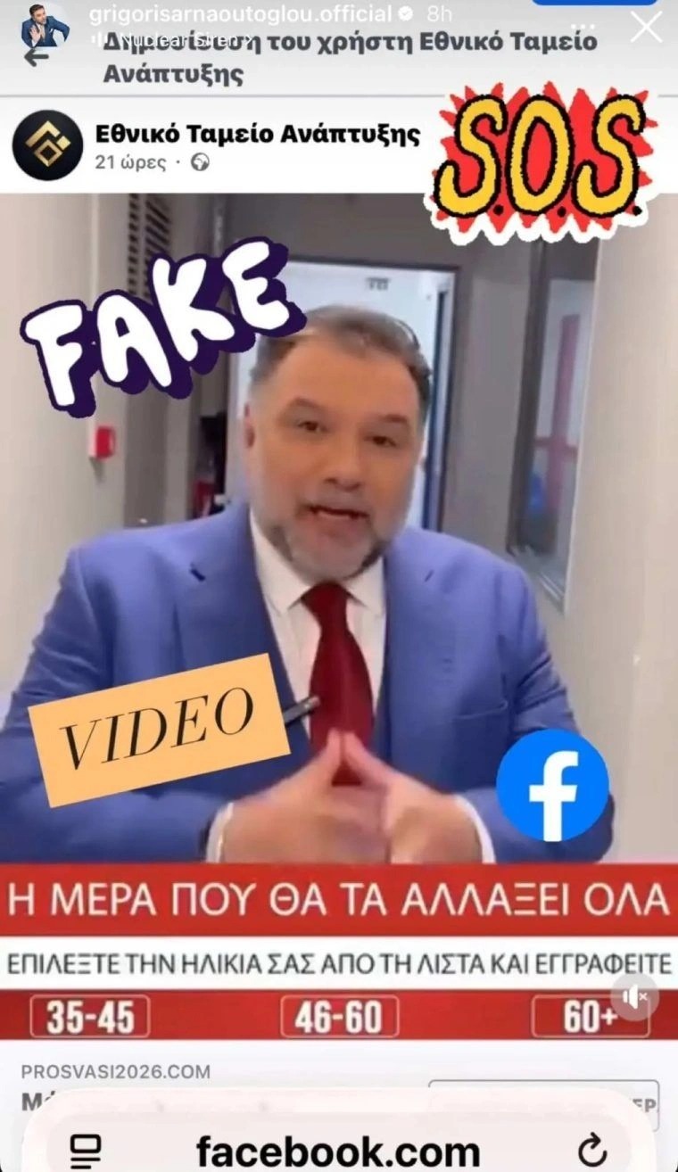 Θύμα διαδικτυακής απάτης έπεσε ο γνωστός τηλεπαρουσιαστής, Γρηγόρης Αρναούτογλου, αφού διαπίστωσε πως στα μέσα κοινωνικής δικτύωσης διακινείται βίντεο στο οποίο φαίνεται να προωθεί μια υπηρεσία, γεγονός που όπως ενημέρωσε δεν ανταποκρίνεται στην πραγματικότητα.