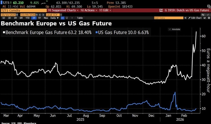 Ενώ το ευρωπαϊκό φυσικό αέριο έχει φτάσει τα 63+ €/MWh, το αμερικανικό Henry Hub κυμαίνεται σταθερά στα 10 $/MWh.