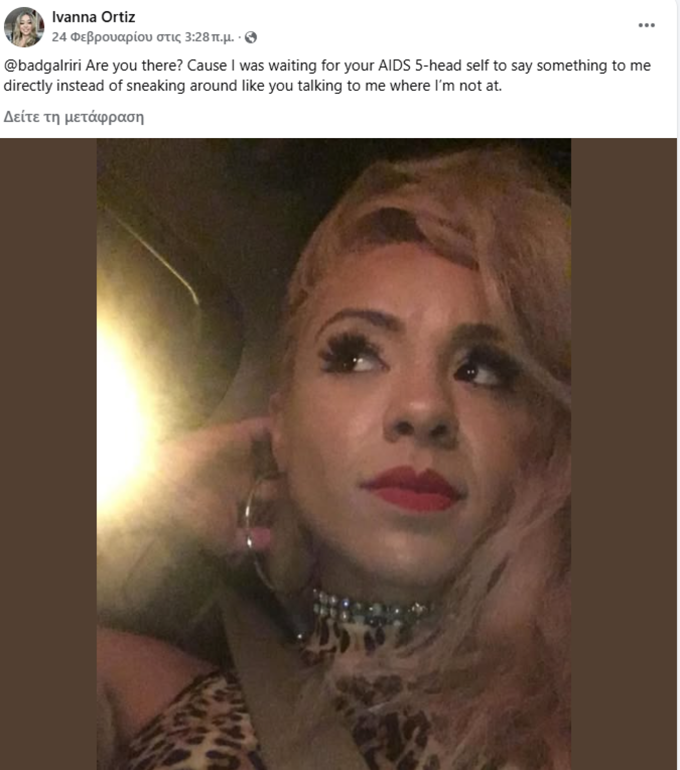 Παράλληλα, σε ανάρτησή της στο Facebook στις 24 Φεβρουαρίου έγραφε απευθυνόμενη στην τραγουδίστρια: «Ριάνα, είσαι εκεί; Γιατί περίμενα να μου μιλήσεις απευθείας, αντί να κινείσαι κρυφά και να μιλάς για μένα εκεί που δεν βρίσκομαι». Σε άλλη ανάρτηση δημοσίευσε φωτογραφία του ράπερ Drake με τη λεζάντα: «Όταν ο Drake έμαθε ότι η Ριάνα έχει AIDS».