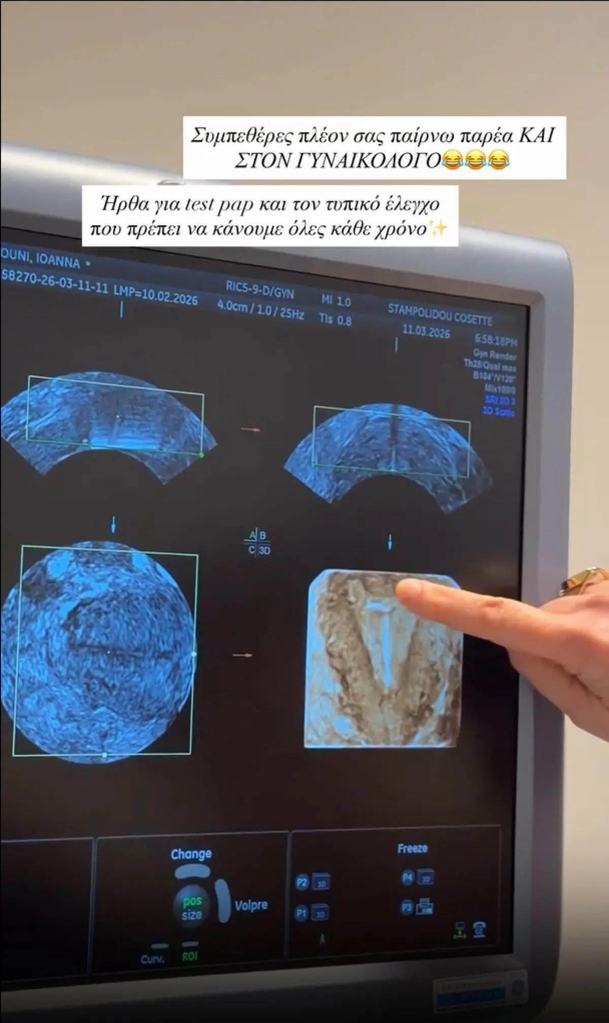 «Συμπεθέρες μου σας παίρνω παρέα και στον γυναικολόγο. Ήρθα για test pap και τον τυπικό έλεγχο που πρέπει να κάνουμε όλες κάθε χρόνο», έγραψε με μία δόση χιούμορ η influencer, ανεβάζοντας σχετικό βίντεο.