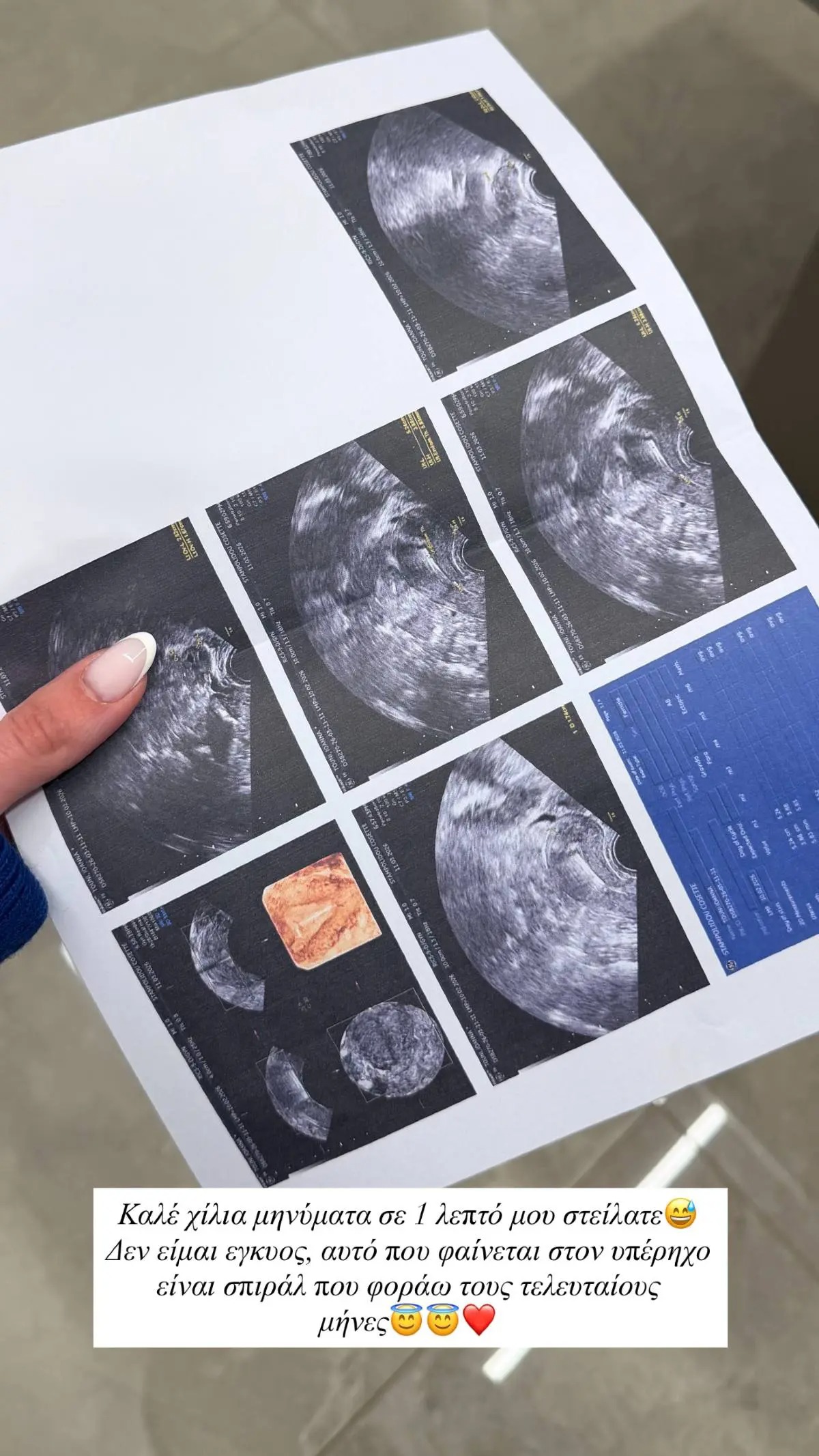 «Καλέ χίλια μηνύματα σε 1 λεπτό μου στείλατε. Δεν είμαι έγκυος, αυτό που φαίνεται στον υπέρηχο είναι σπιράλ που φοράω τους τελευταίους μήνες», εξήγησε η Ιωάννα Τούνη, βάζοντας τέλος στην παρεξήγηση που δημιουργήθηκε προς στιγμήν στα social media.