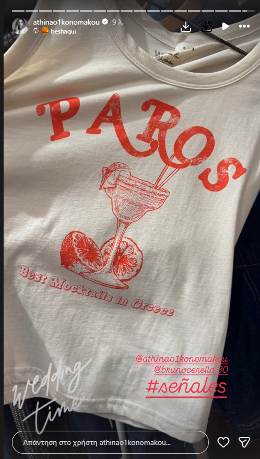 Πιο συγκεκριμένα, η Αθηνά Οικονομάκου έκανε repost μια φωτογραφία με ένα μπλουζάκι από την Πάρο και τη φράση «Wedding Time», αφήνοντας να εννοηθεί πως η μεγάλη στιγμή πλησιάζει.