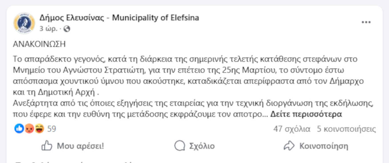 Σε ανακοίνωσή του, ο Δήμος Ελευσίνας χαρακτήρισε το γεγονός «απαράδεκτο» και καταδίκασε απερίφραστα την αναπαραγωγή του χουντικού ύμνου κατά τη διάρκεια της τελετής στο Μνημείο του Αγνώστου Στρατιώτη για την επέτειο της 25ης Μαρτίου.