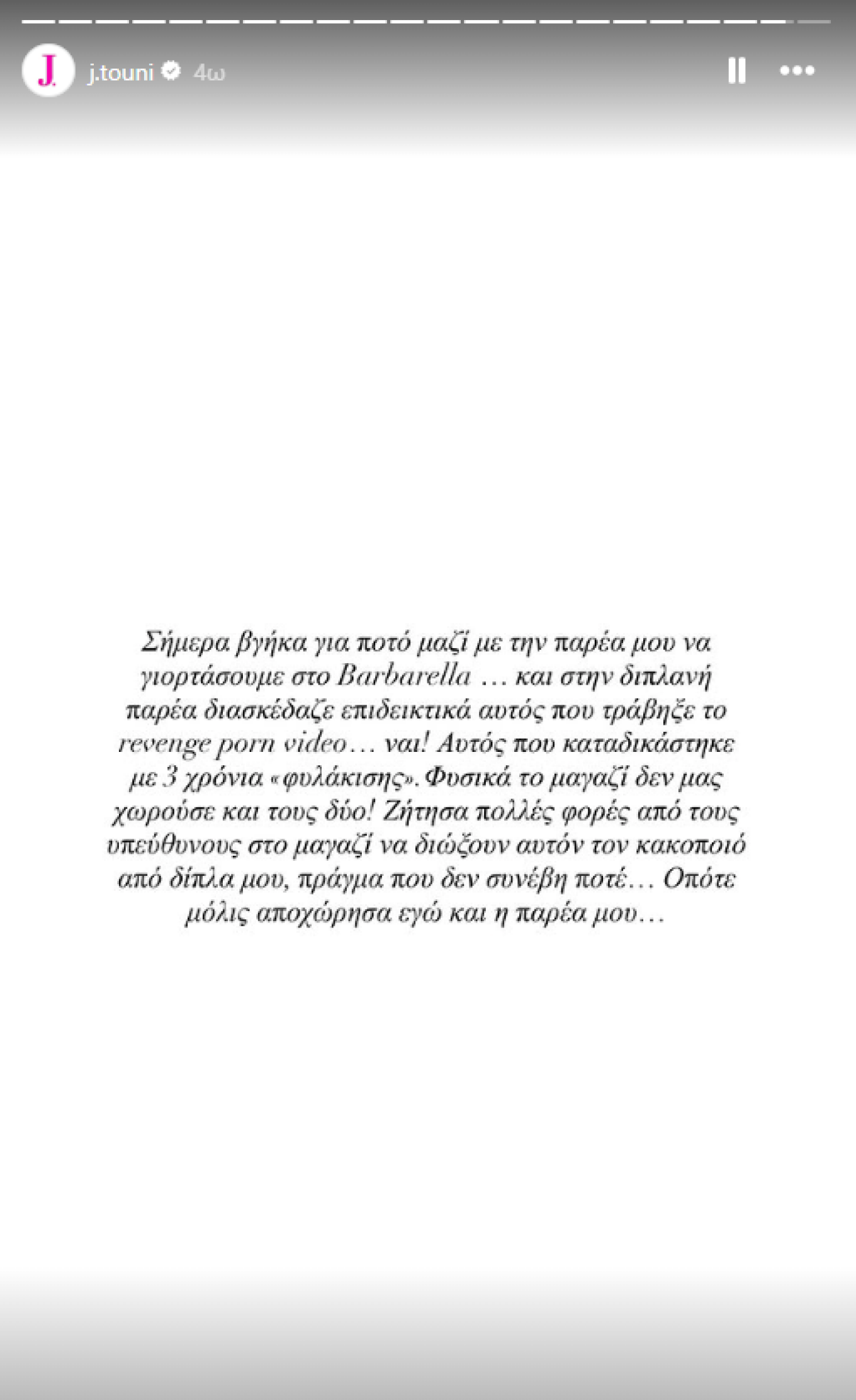 Αρχικά έγραψε: «Σήμερα βγήκα για ποτό μαζί με την παρέα μου να γιορτάσουμε και στη διπλανή παρέα διασκέδαζε επιδεικτικά αυτός που τράβηξε το revenge ρorn video… Ναι! Αυτός που καταδικάστηκε με 3 χρόνια «φυλάκισης». Φυσικά το μαγαζί δεν μας χωρούσε και τους δύο! Ζήτησα πολλές φορές από τους υπεύθυνους στο μαγαζί να διώξουν αυτόν τον κακοποιό από δίπλα μου, πράγμα που δεν συνέβη ποτέ… Οπότε μόλις αποχώρησα εγώ και η παρέα μου…».