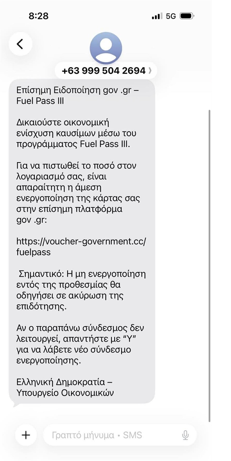 Νέα απόπειρα εξαπάτησης πολιτών μέσω γραπτών μηνυμάτων (SMS) στα κινητά τηλέφωνα, με πρόσχημα την καταβολή επιδόματος καυσίμων «Fuel Pass III».