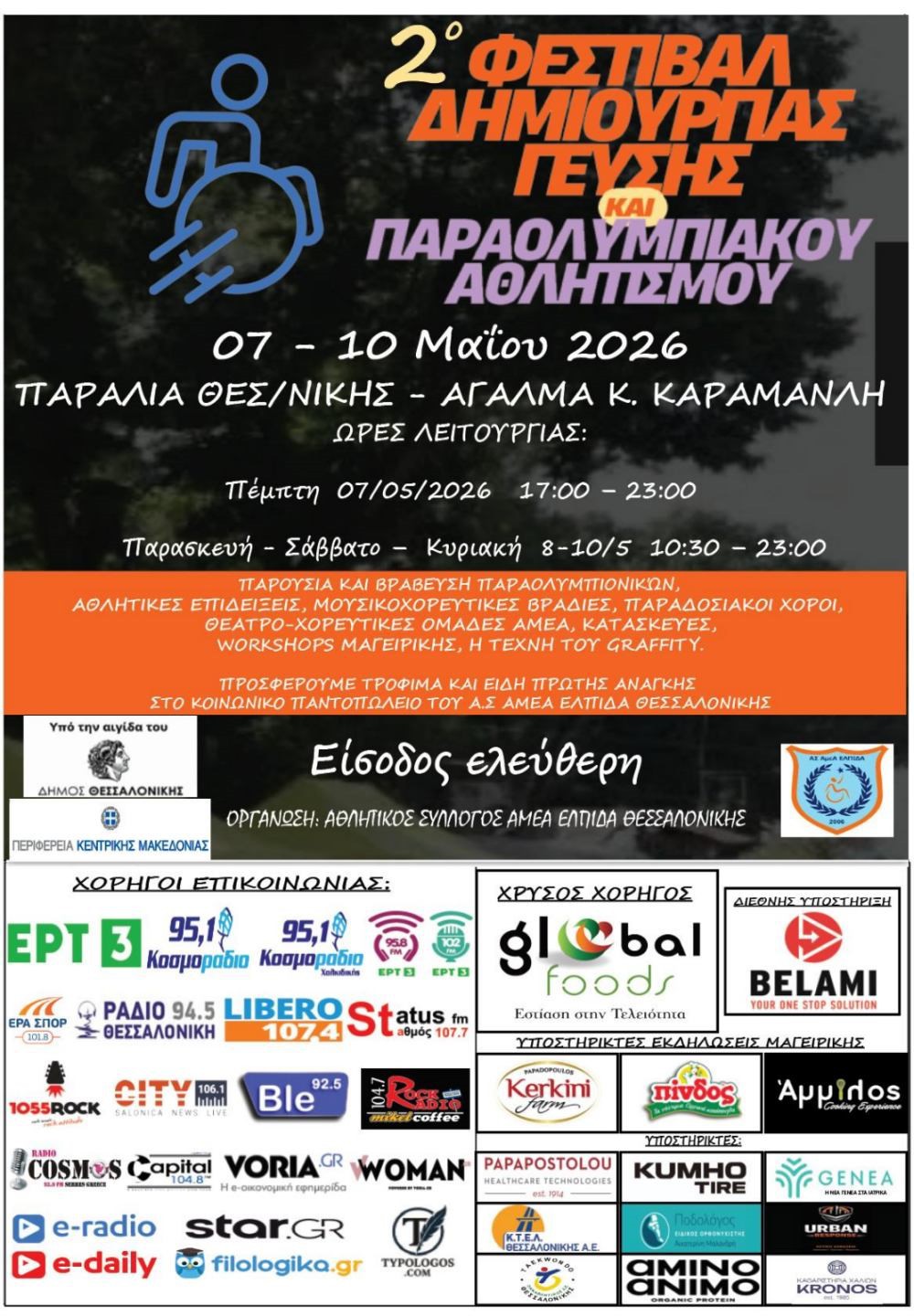 Ο Αθλητικός Σύλλογος ανθρώπων με αναπηρίες (ΑμεΑ) ΕΛΠΙΔΑ Θεσσαλονίκης, διοργανώνει στις 7 Μαΐου έως και 10 Μαΐου 2026 στην παραλία Θεσσαλονίκης (άγαλμα Κ. Καραμανλή) το 2ο Φεστιβάλ Δημιουργίας- Γεύσης & Παραολυμπιακού αθλητισμού.